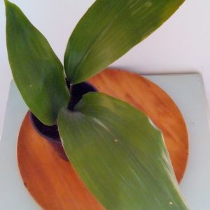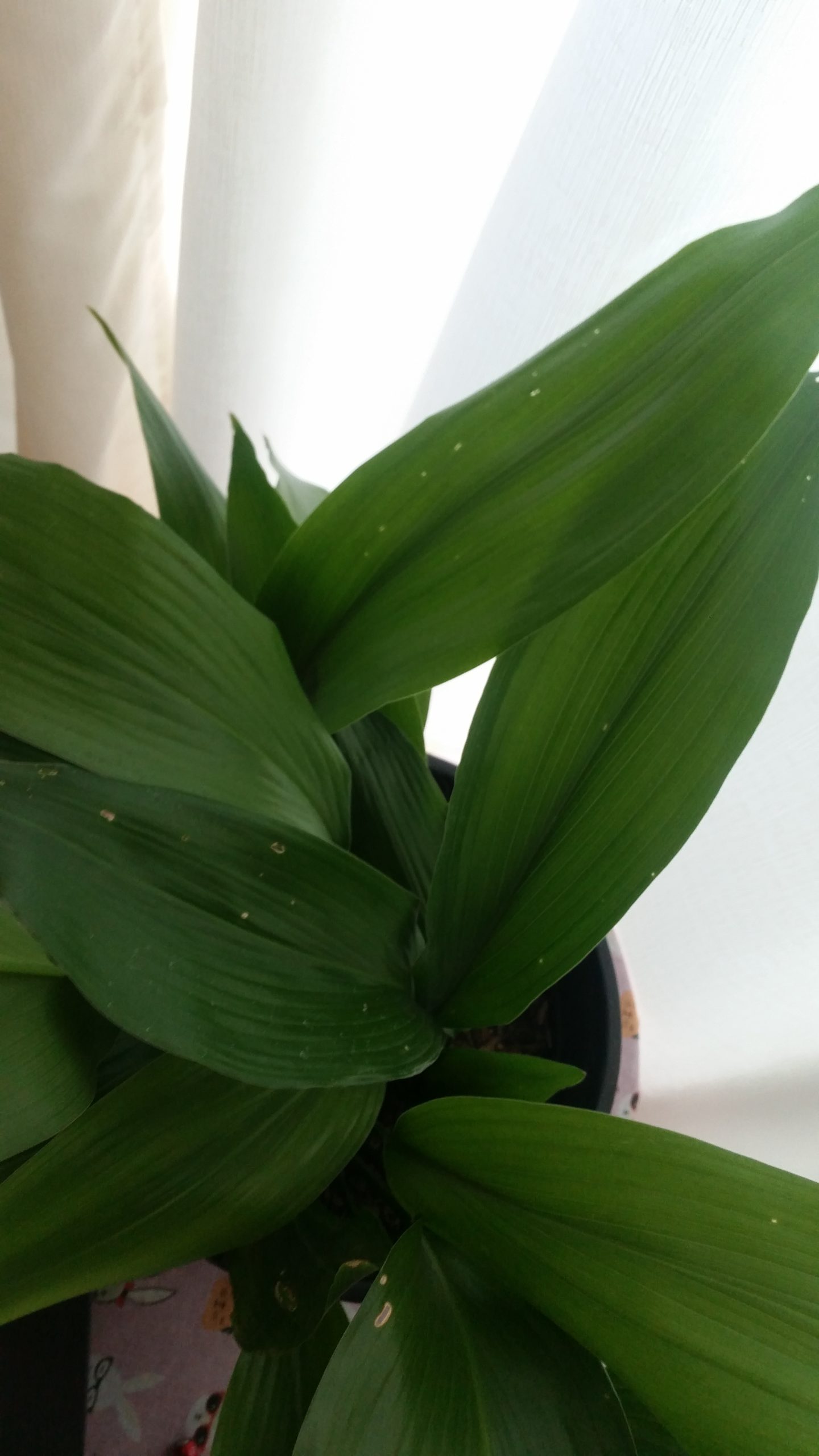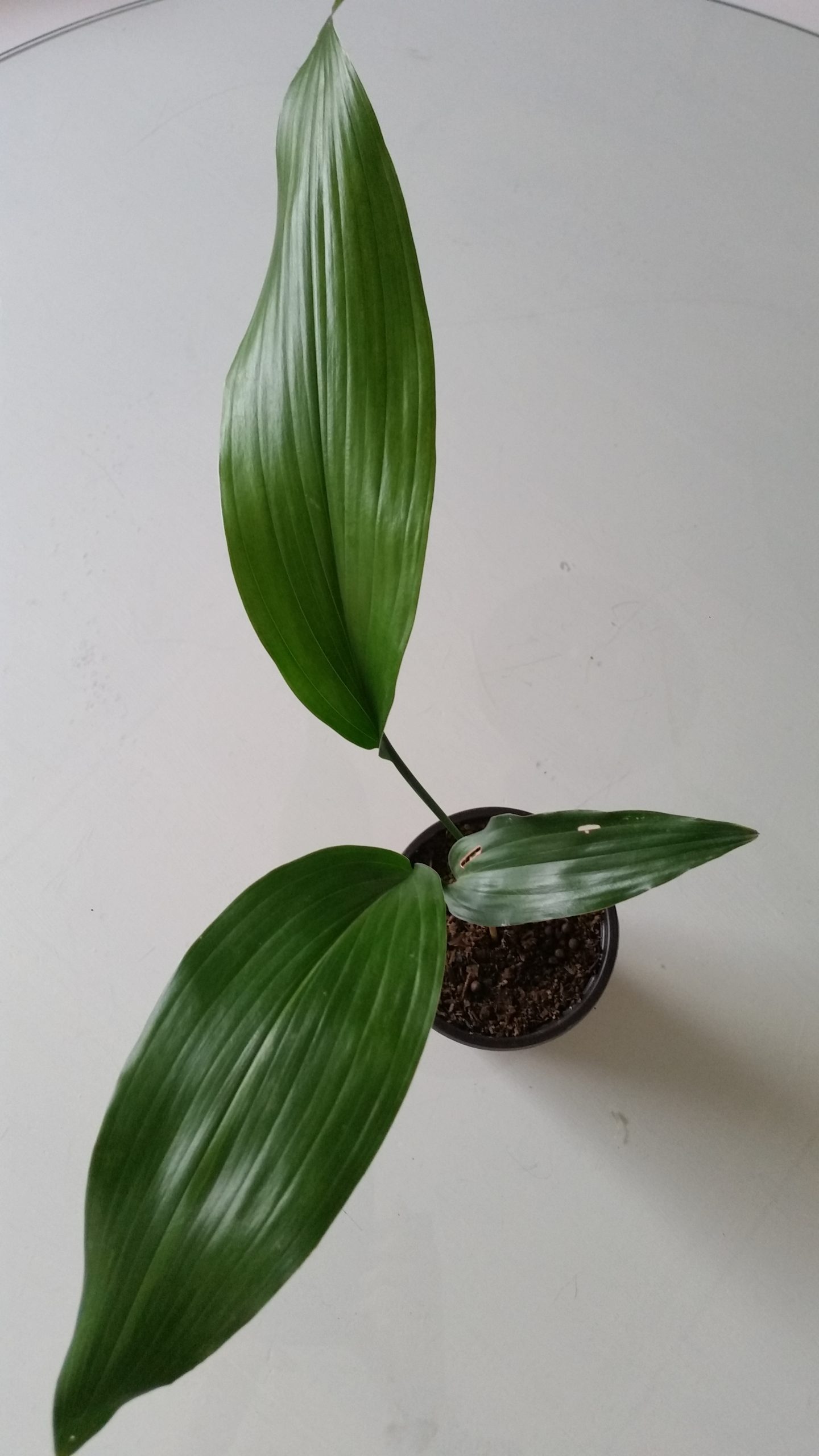The traditional Aspidistra elatior. The non-variegated leaves are mid-to-deep green, with colour variations limited to slight muted yellow  stripes.